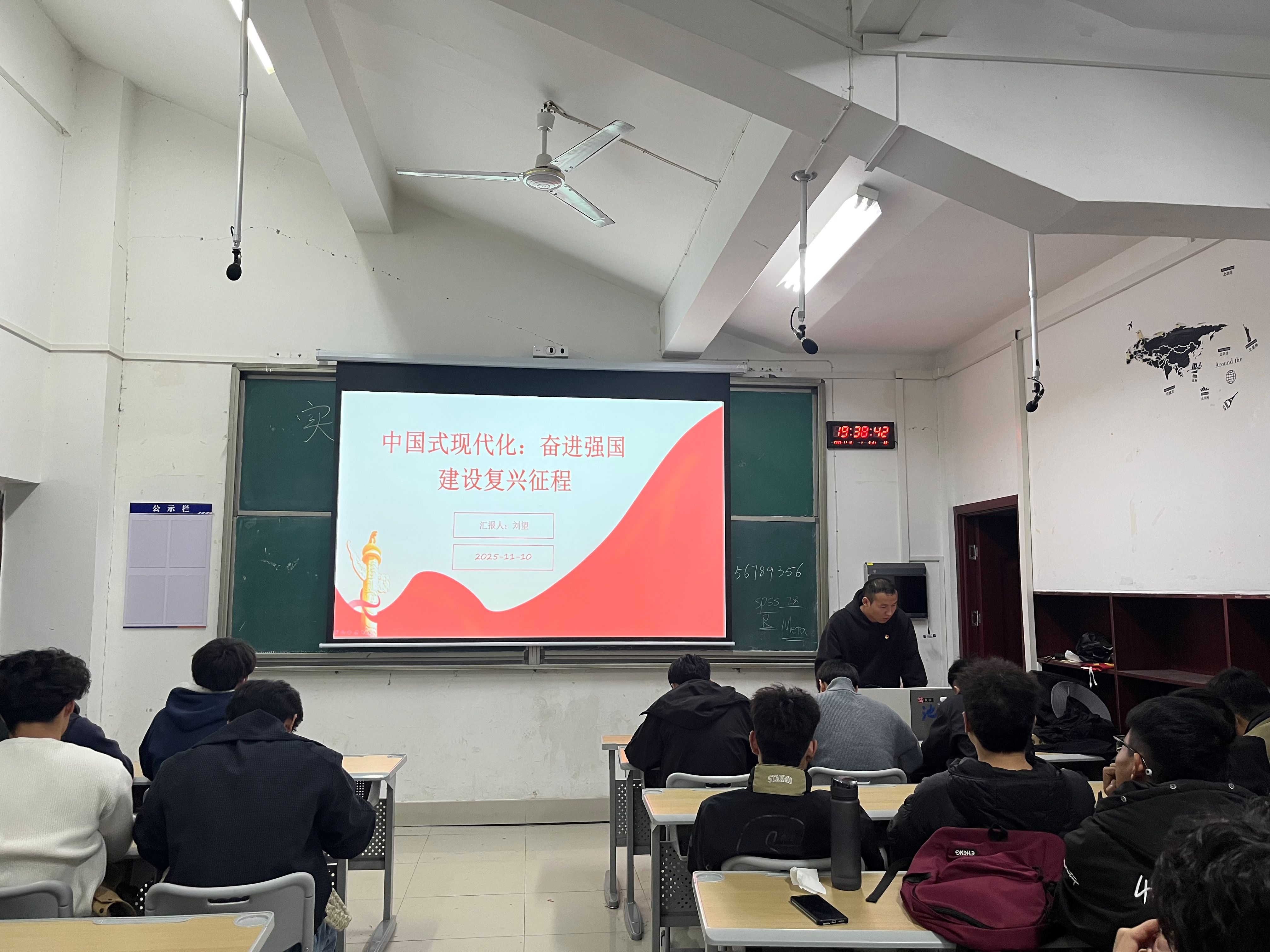 班会在庄严的国歌声中开始。随后,党员青年宣讲团的成员们依次登场,他们结合自身学习体会与体育专业特色,用朴实的语言、真挚的情感和专业的视角,将宏大的主题转化为身边可知可感的内容,赢得了现场同学的阵阵掌声。在互动环节,还特别设置了别开生面的“现代化热词接龙”活动。